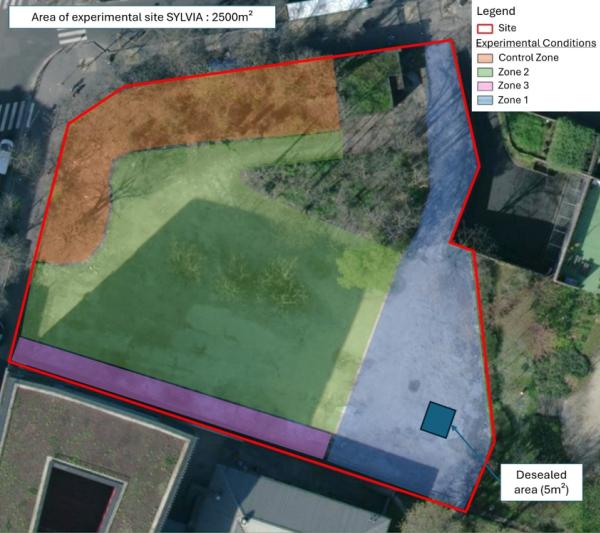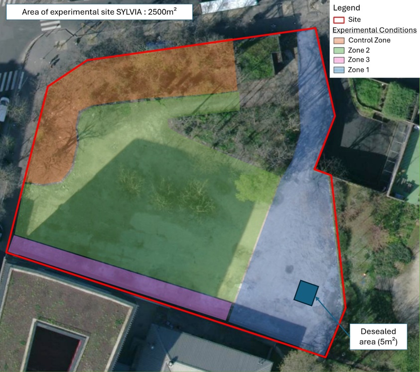 Le site d’étude est une friche récemment désimperméabilisée et renaturée par l’entreprise d’agriculture urbaine Cultures en Ville (gestionnaire du site et partenaire du projet). Localisée dans le 14eme arrondissement de Paris, cette friche nommée Sylvia possède une surface d’expérimentation d’un peu moins de 2000m². Des prélèvements préliminaires ont mis en évidence une contamination diffuse et modérée des sols, typique du bruit de fond de sols urbains.
