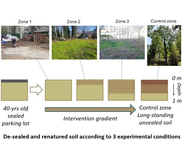 Situé en plein cœur urbain de Paris, le site d’étude était recouvert d’une dalle de parking qui a été partiellement démolie courant 2022 afin de favoriser le développement d'une future microforêt urbaine comestible. L'intérêt de ce site est de présenter, au sein d’un même lieu, un gradient de désartificialisation et de renaturation avec la juxtaposition de plusieurs types de modalités expérimentales qui seront étudiées au travers du panel d’indicateurs de santé des sols :